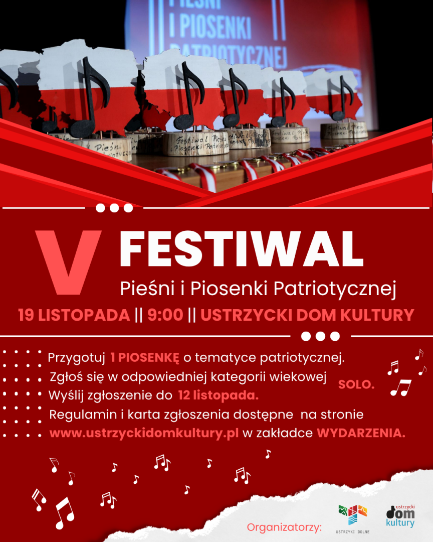 Ustrzycki Dom Kultury serdecznie zaprasza do udziału w V Festiwalu Pieśni i Piosenki Patriotycznej, który odbędzie się 19 listopada 2025 roku o godz. 9:00 w siedzibie UDK przy ul. 29 Listopada 31 w Ustrzykach Dolnych.