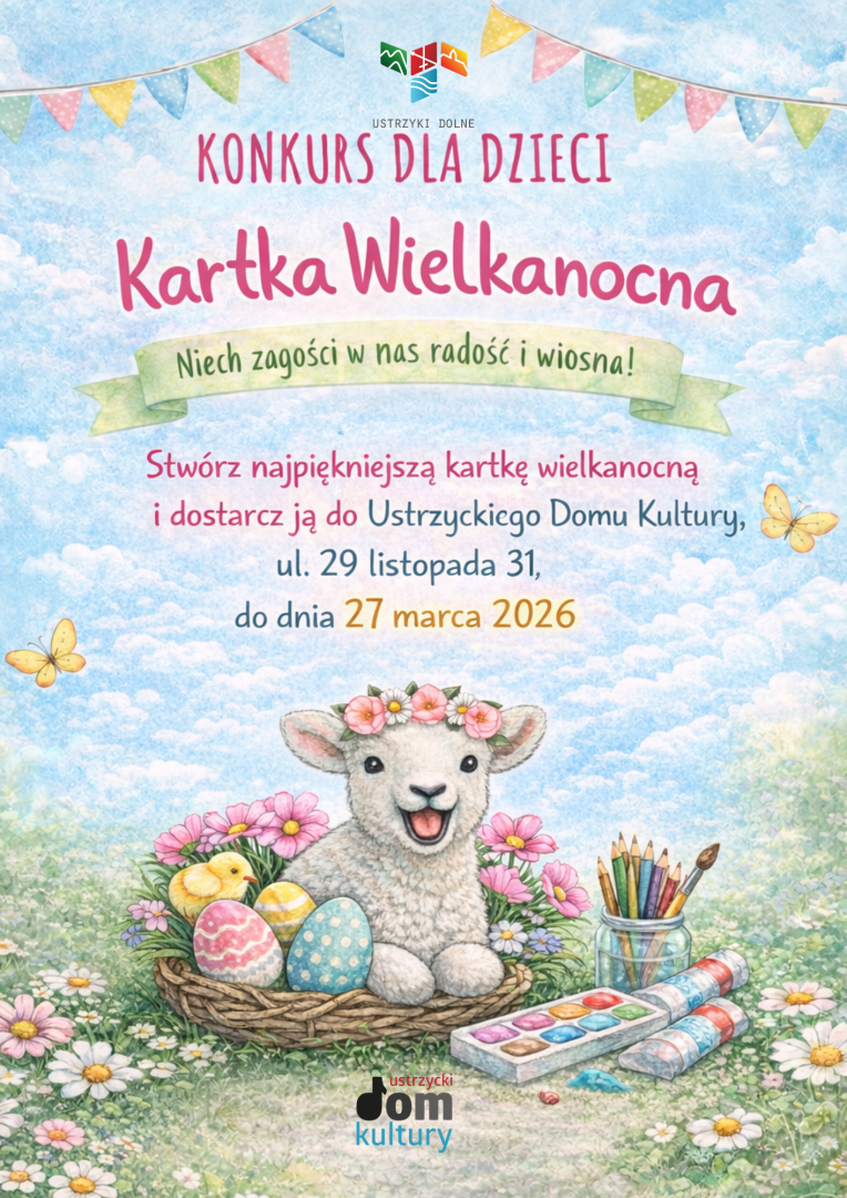 Ustrzycki Dom Kultury i Gmina Ustrzyki Dolne zaprasza dzieci do udziału w konkursie plastycznym „Kartka Wielkanocna”.