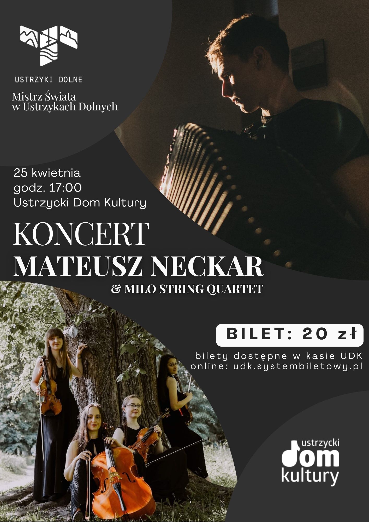 Tym razem na scenie Ustrzyckiego Domu Kultury wystąpi wraz z MILO String Quartet – zespołem młodych kameralistek związanych z Akademią Muzyczną im. Krzysztofa Pendereckiego w Krakowie, docenianym na konkursach i festiwalach w całej Polsce.